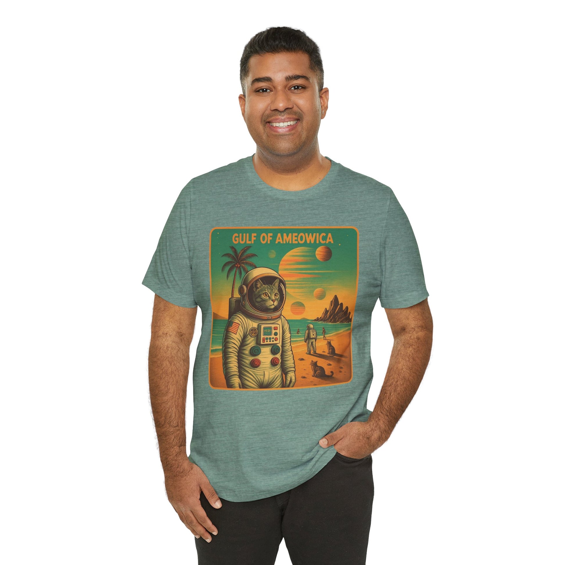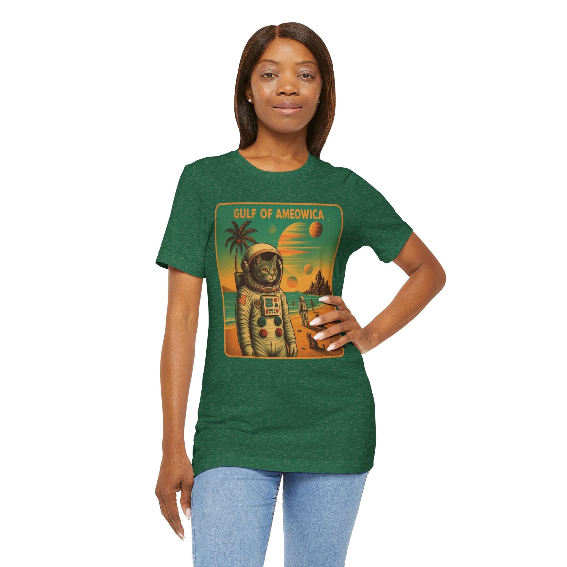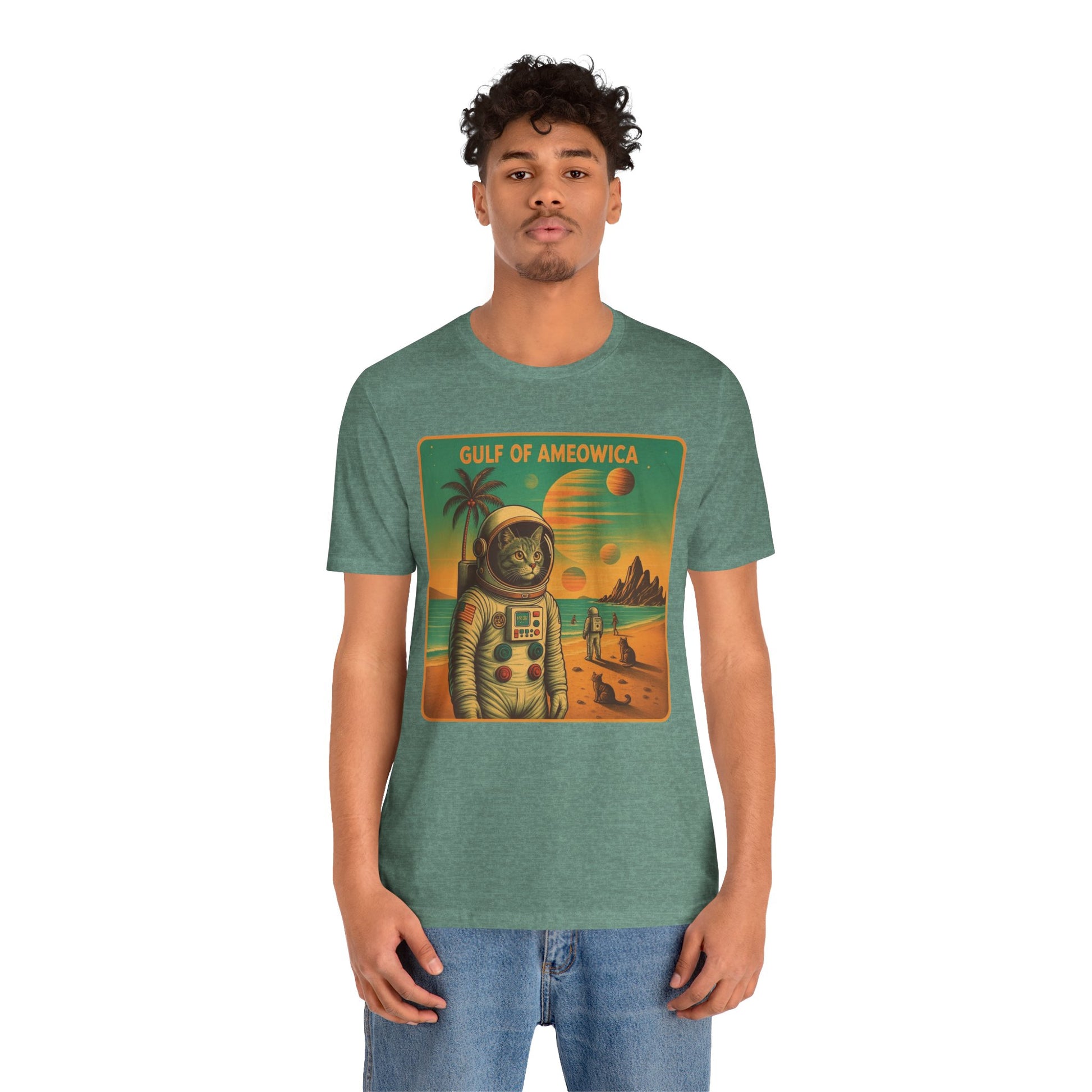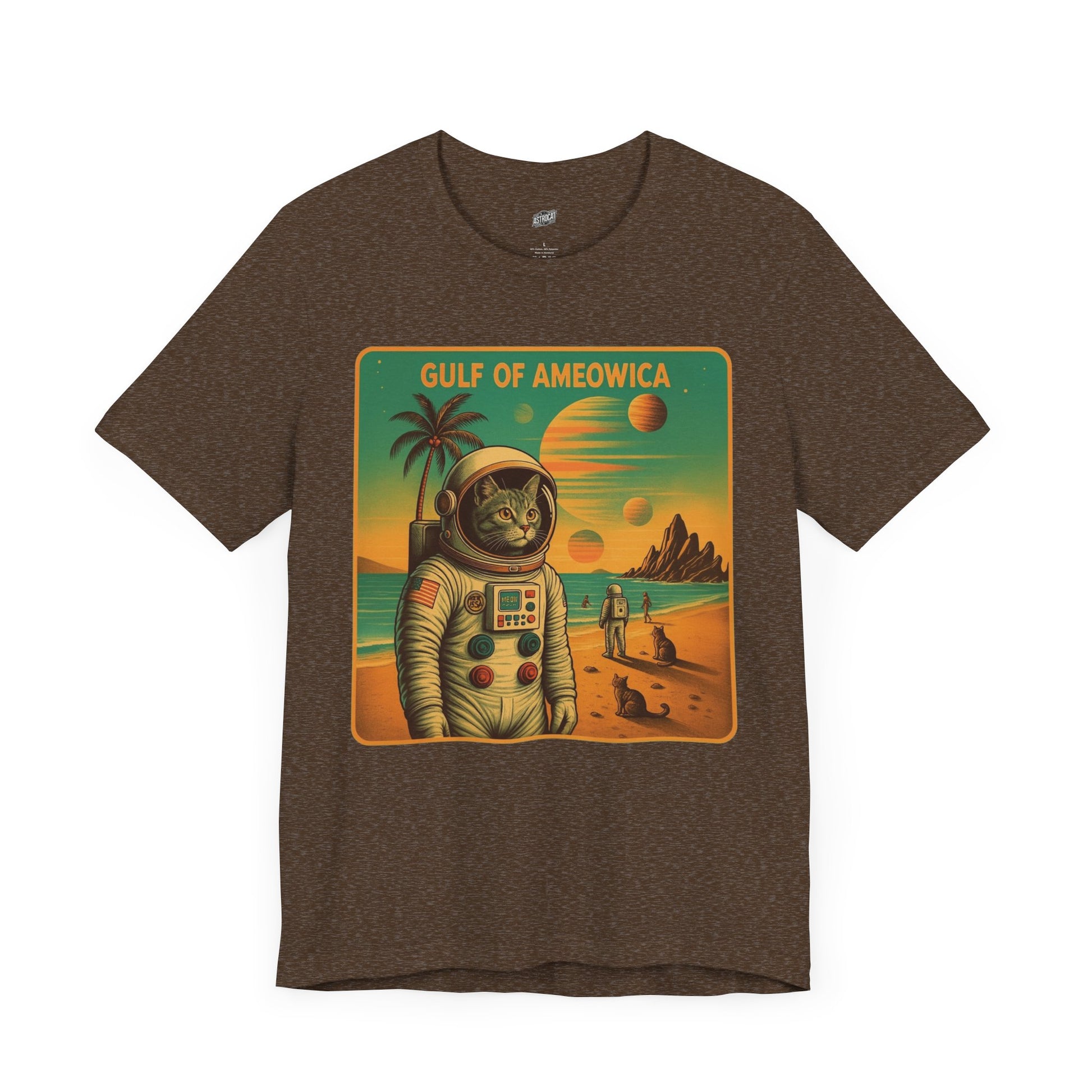 The Gulf Of Meowxico Astrocat Tee is a fun and vibrant shirt that features a unique design perfect for cat lovers and space enthusiasts. Made with 100% lightweight cotton, this tee is breathable and ideal for both active and leisure wear. With a retail fit and classic crew neckline, it's suitable for casual and semi-formal settings. Perfect for holidays, birthdays, and everyday wear.