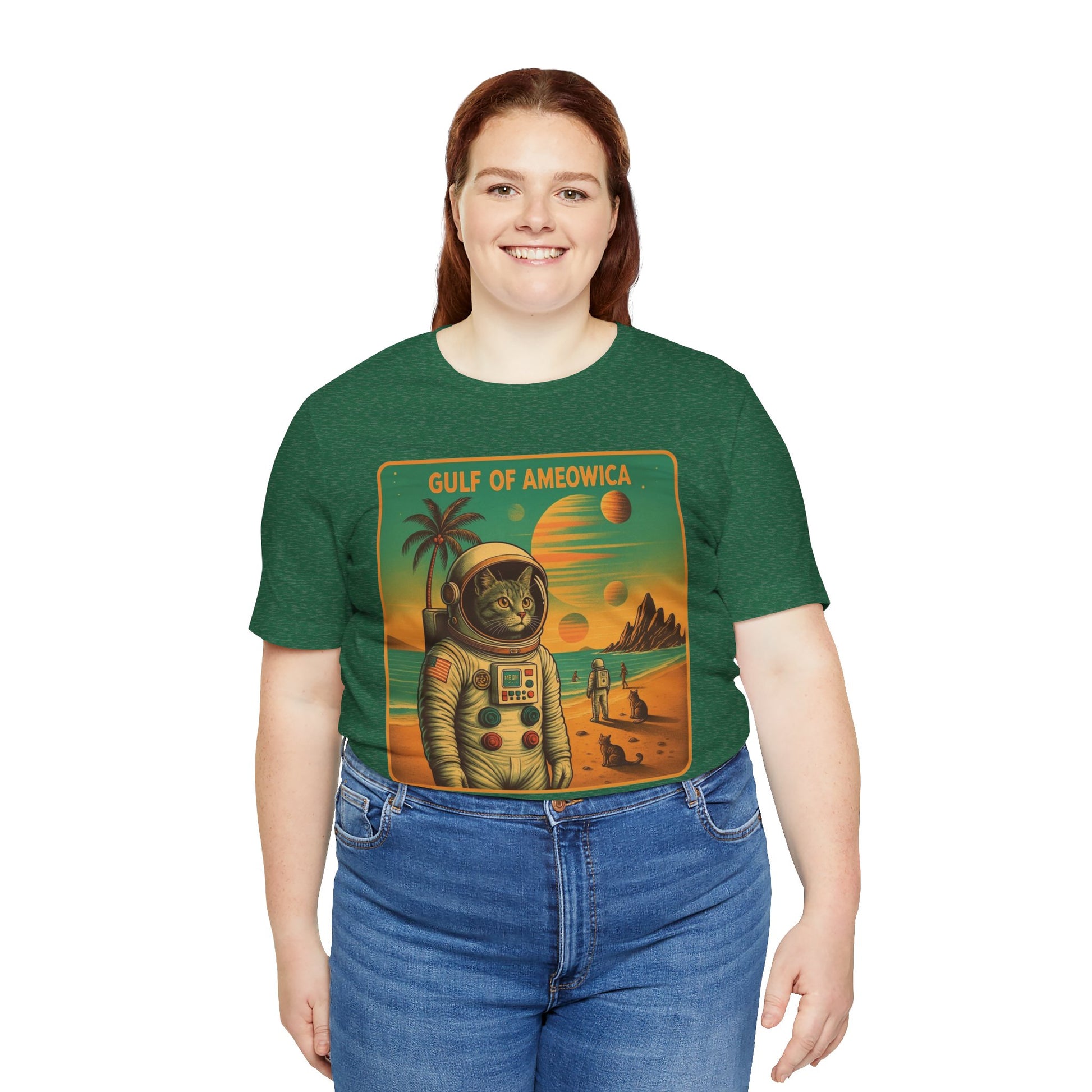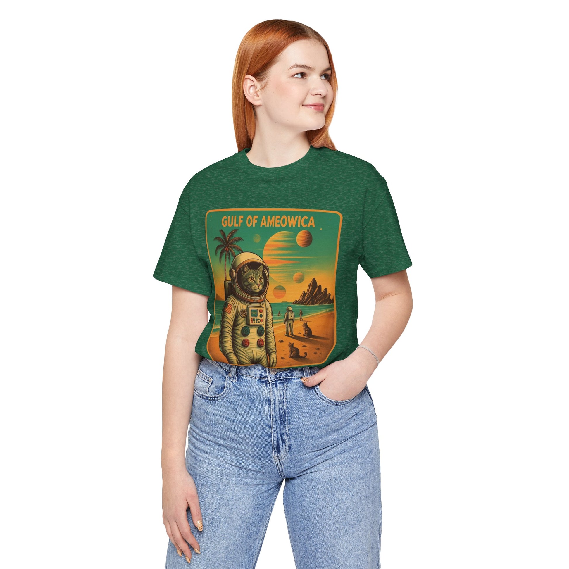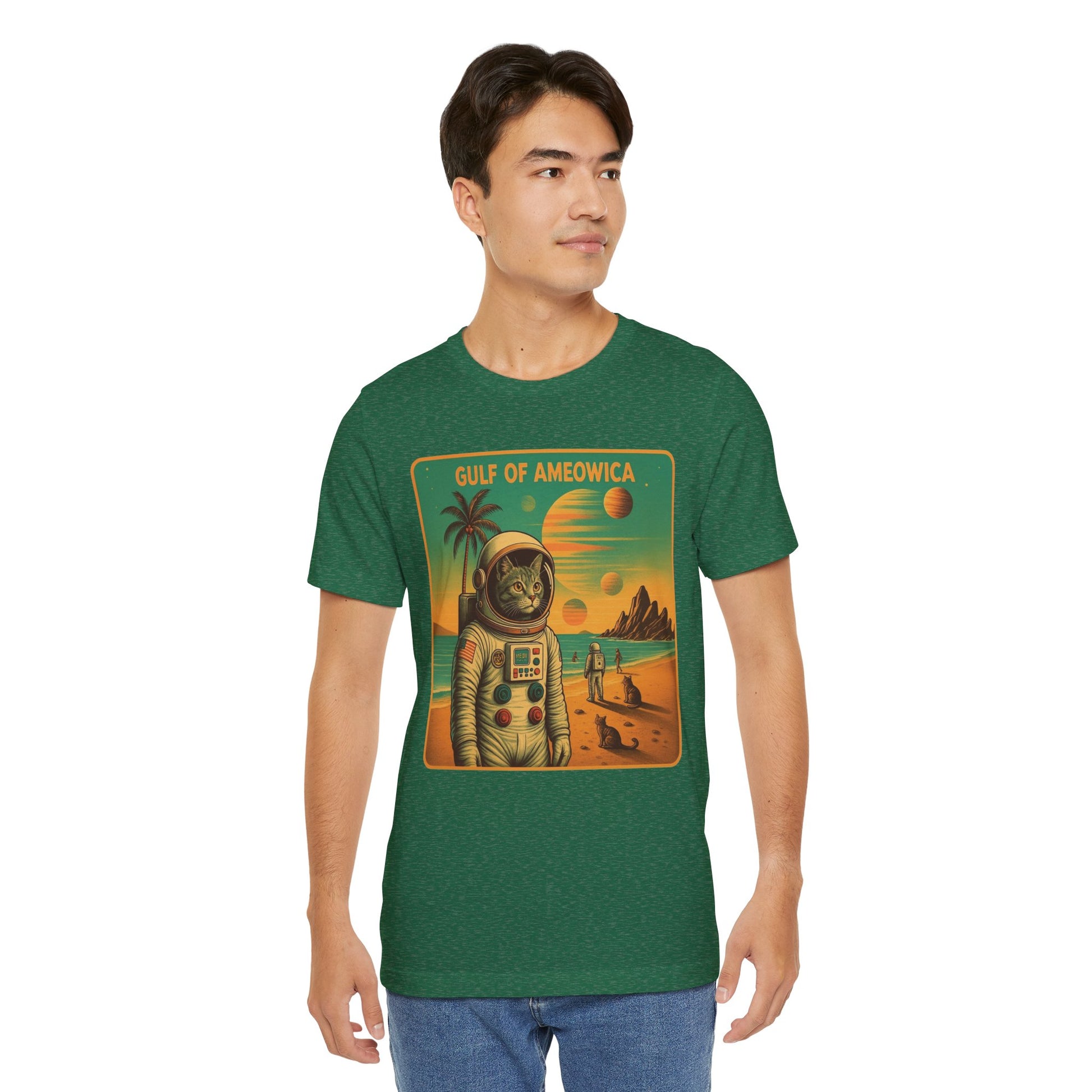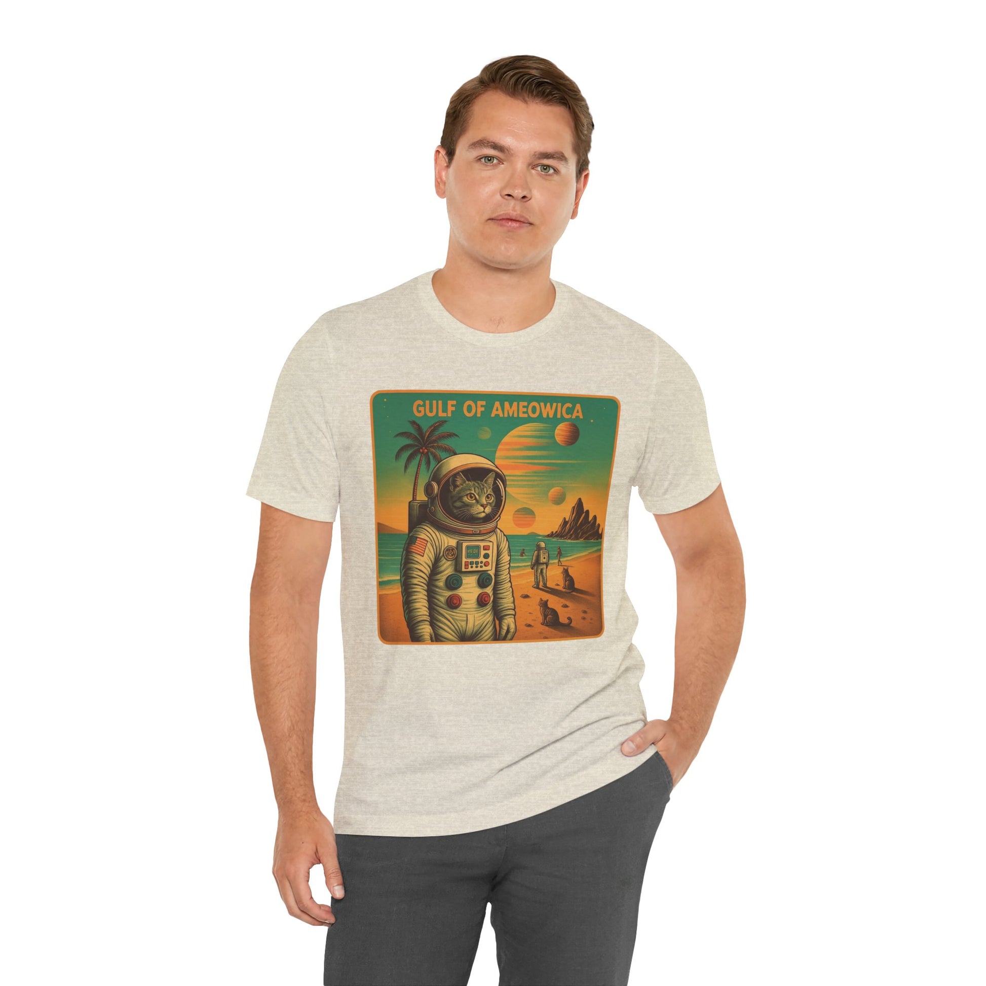 The Gulf Of Meowxico Astrocat Tee is a fun and vibrant shirt that features a unique design perfect for cat lovers and space enthusiasts. Made with 100% lightweight cotton, this tee is breathable and ideal for both active and leisure wear. With a retail fit and classic crew neckline, it's suitable for casual and semi-formal settings. Perfect for holidays, birthdays, and everyday wear.