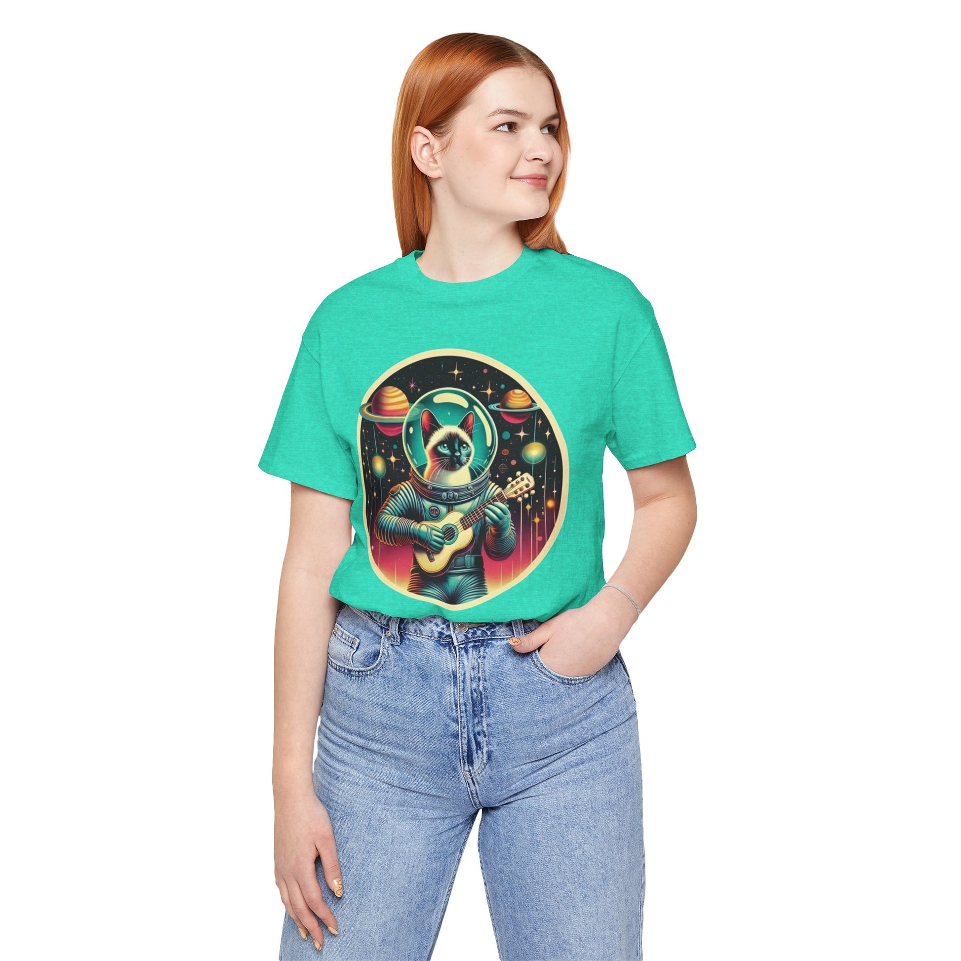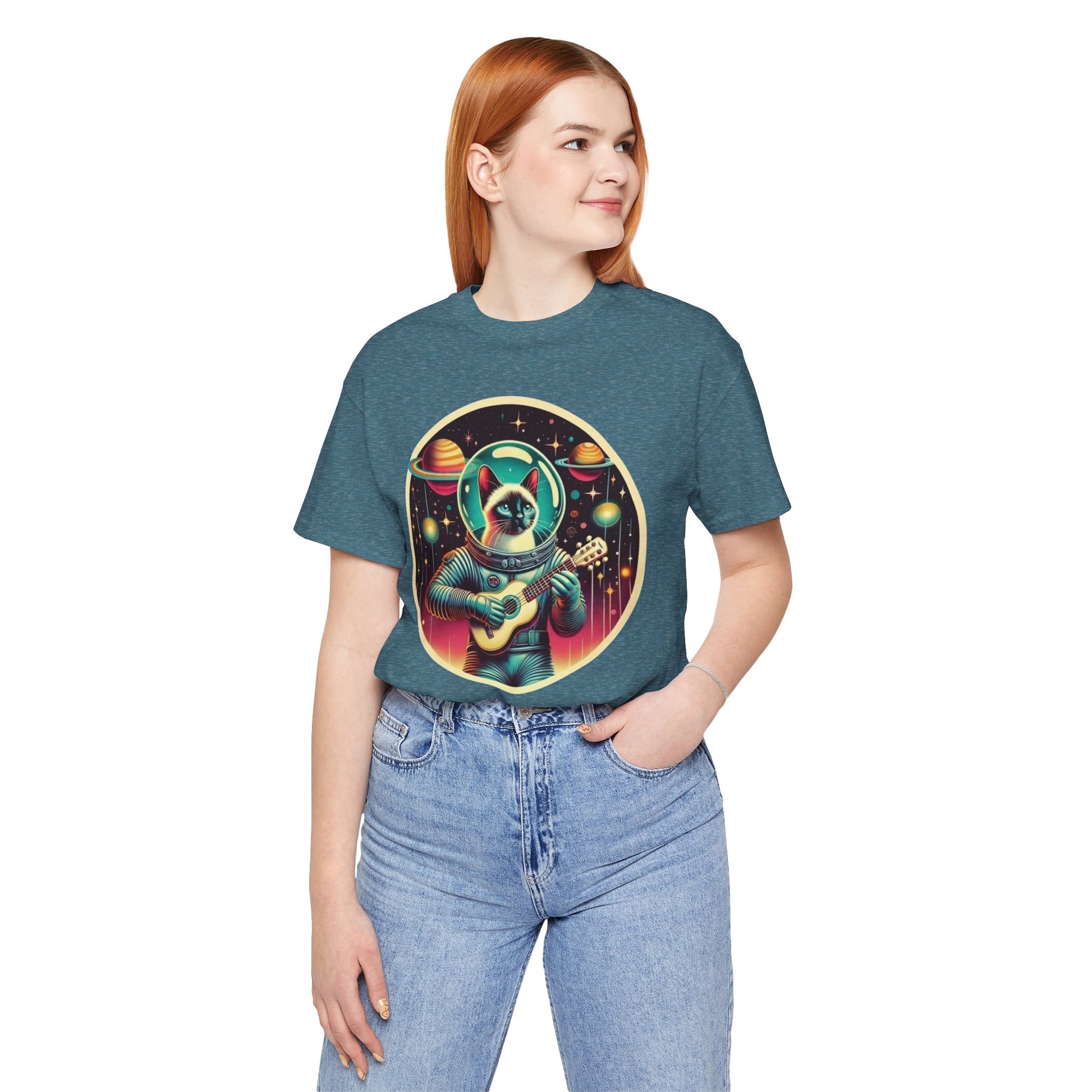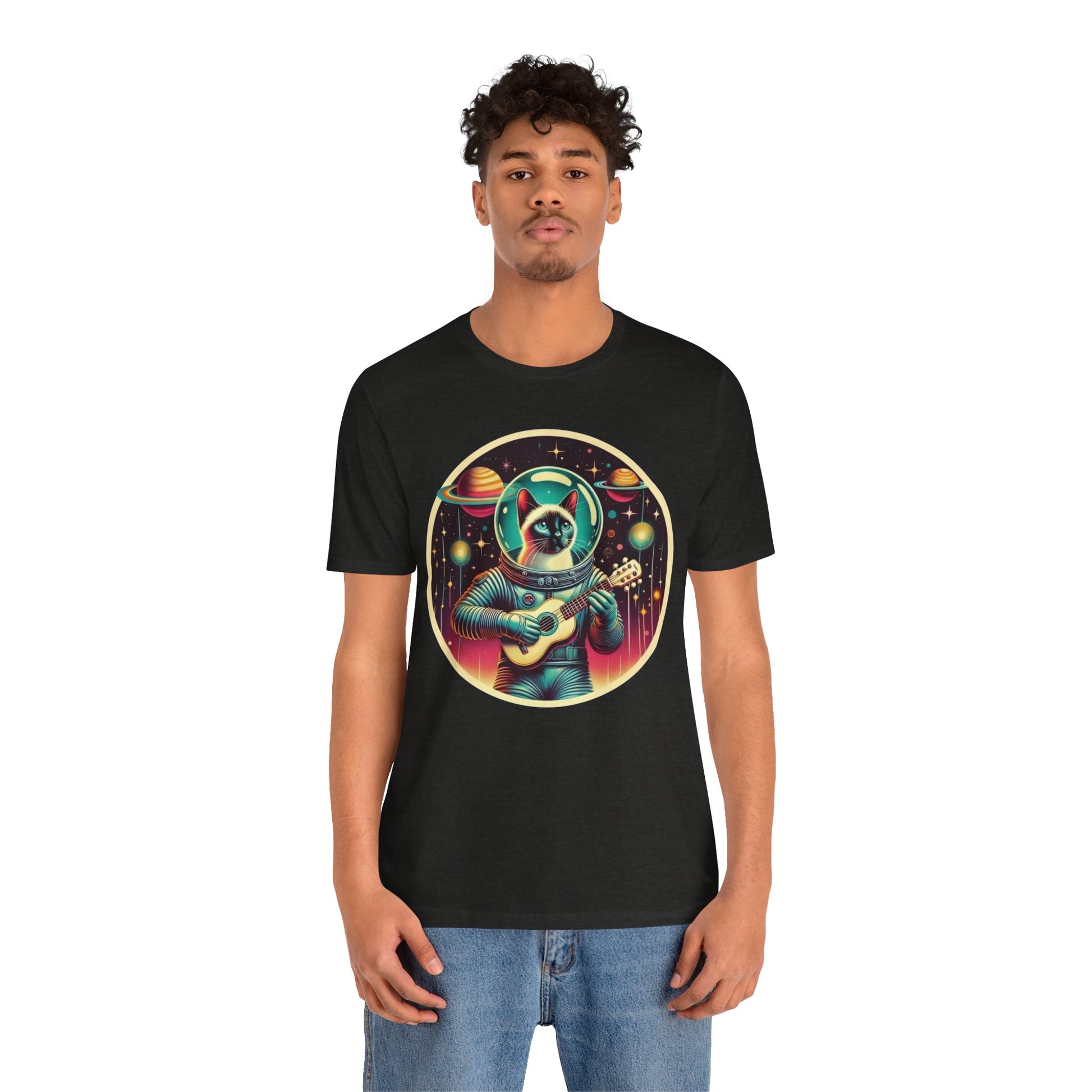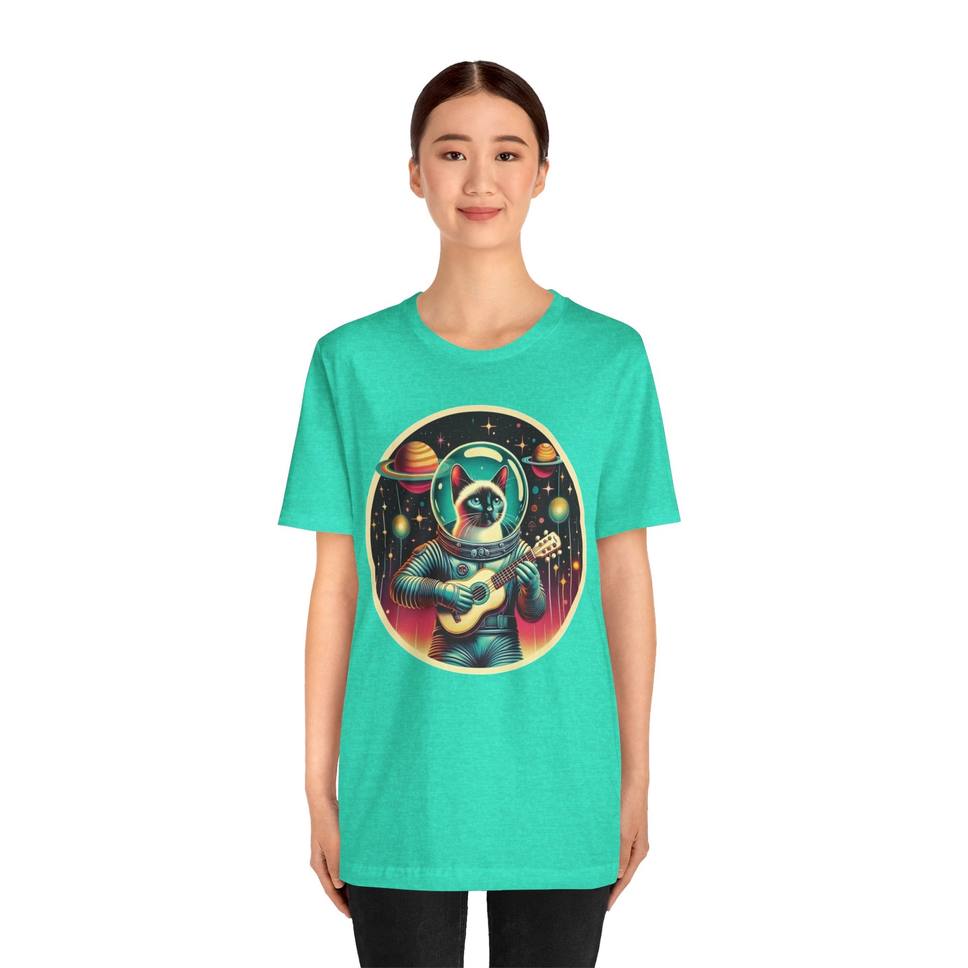 This Guitar Astrocat Tee exudes a fun and quirky vibe, perfect for music lovers and cat enthusiasts. It can be worn casually or styled for a semi-formal look, making it versatile for various occasions. Ideal for those who enjoy unique and playful designs, this tee is a great addition to your wardrobe. Perfect for music festivals, casual outings, or as a gift for a friend who loves cats and guitars.