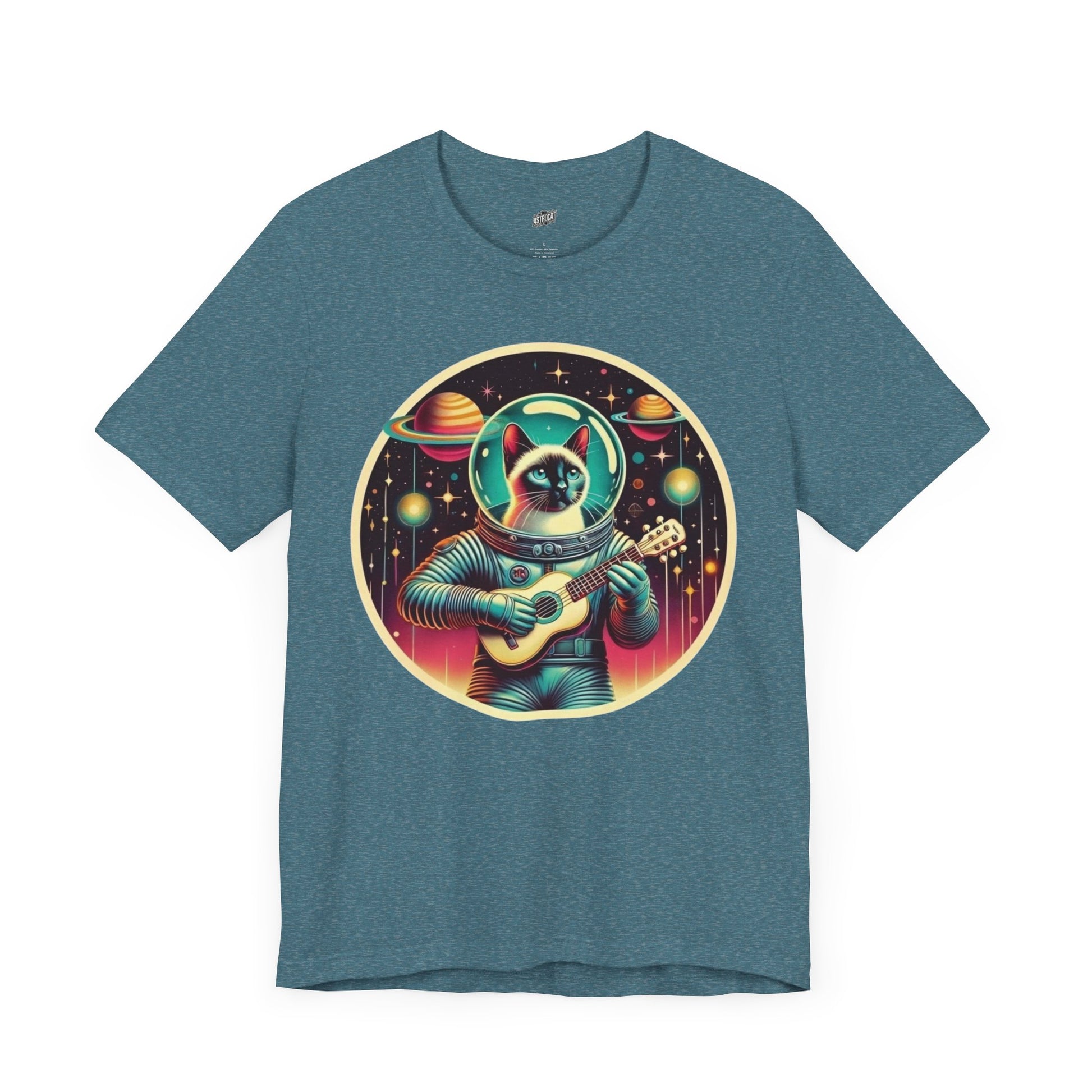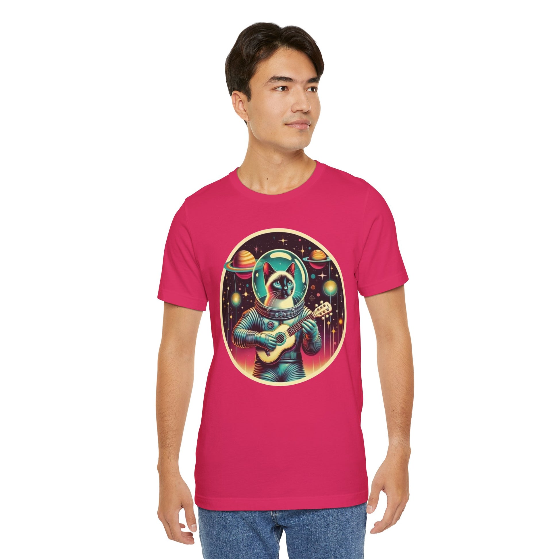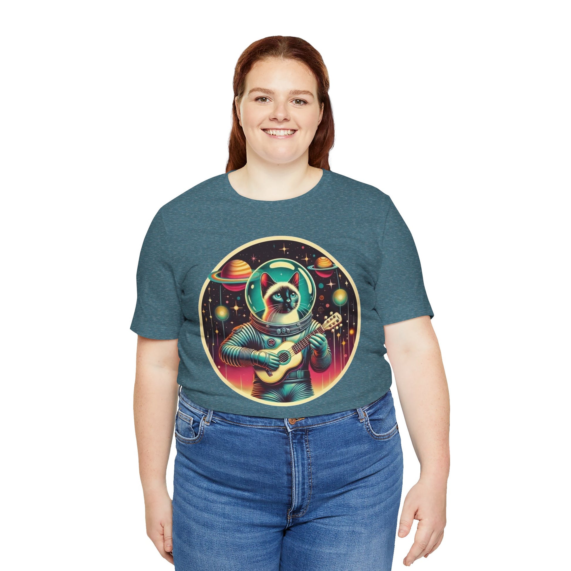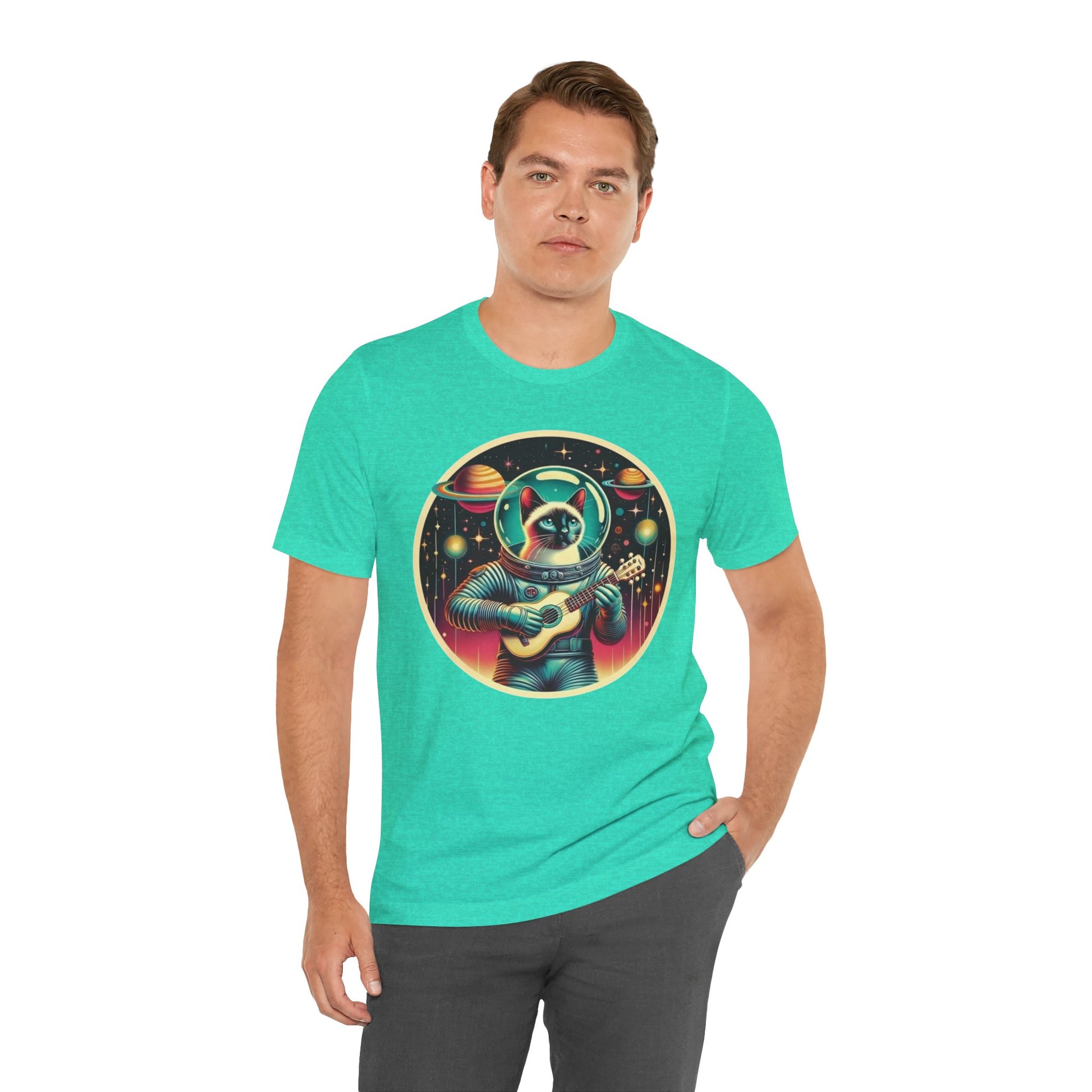 This Guitar Astrocat Tee exudes a fun and quirky vibe, perfect for music lovers and cat enthusiasts. It can be worn casually or styled for a semi-formal look, making it versatile for various occasions. Ideal for those who enjoy unique and playful designs, this tee is a great addition to your wardrobe. Perfect for music festivals, casual outings, or as a gift for a friend who loves cats and guitars.