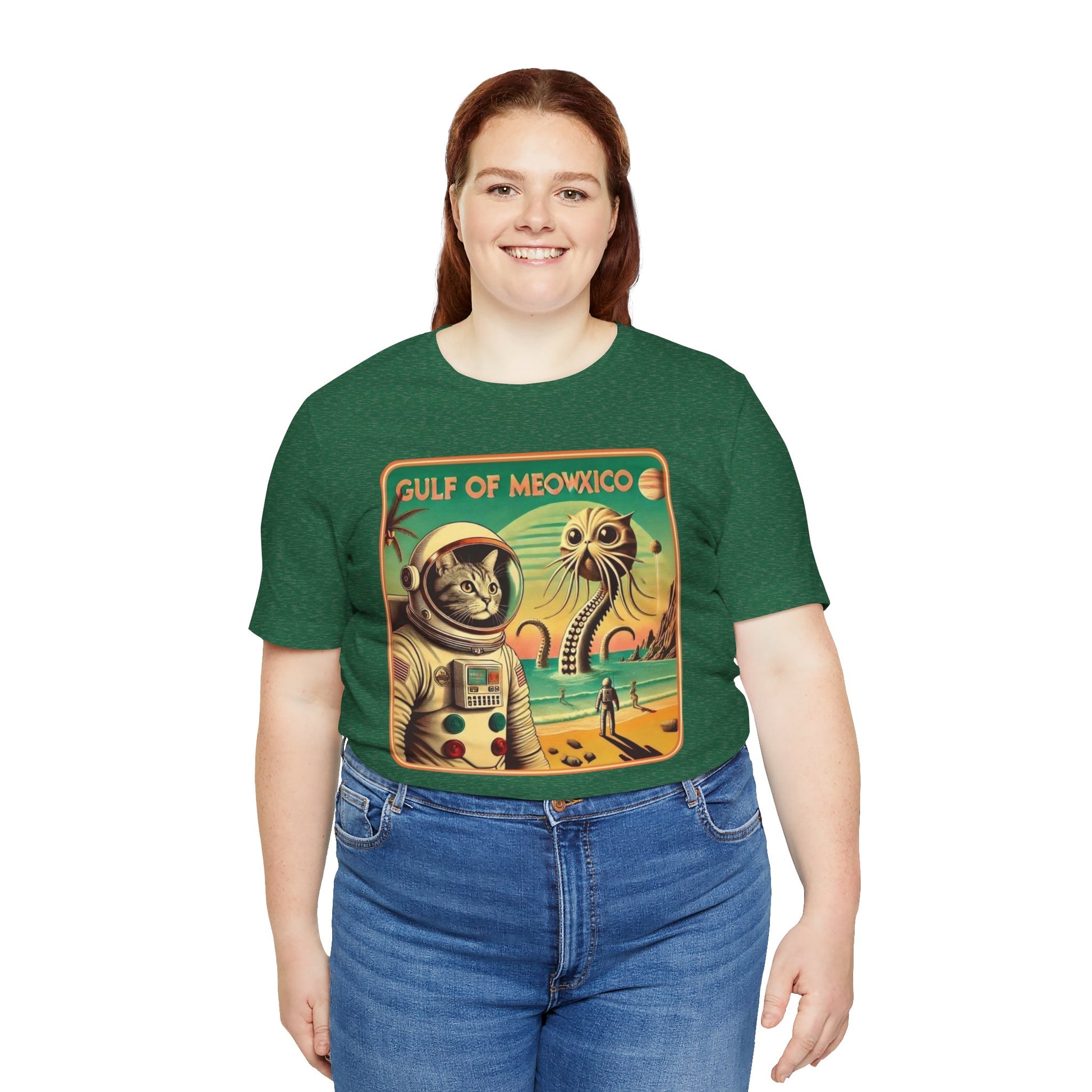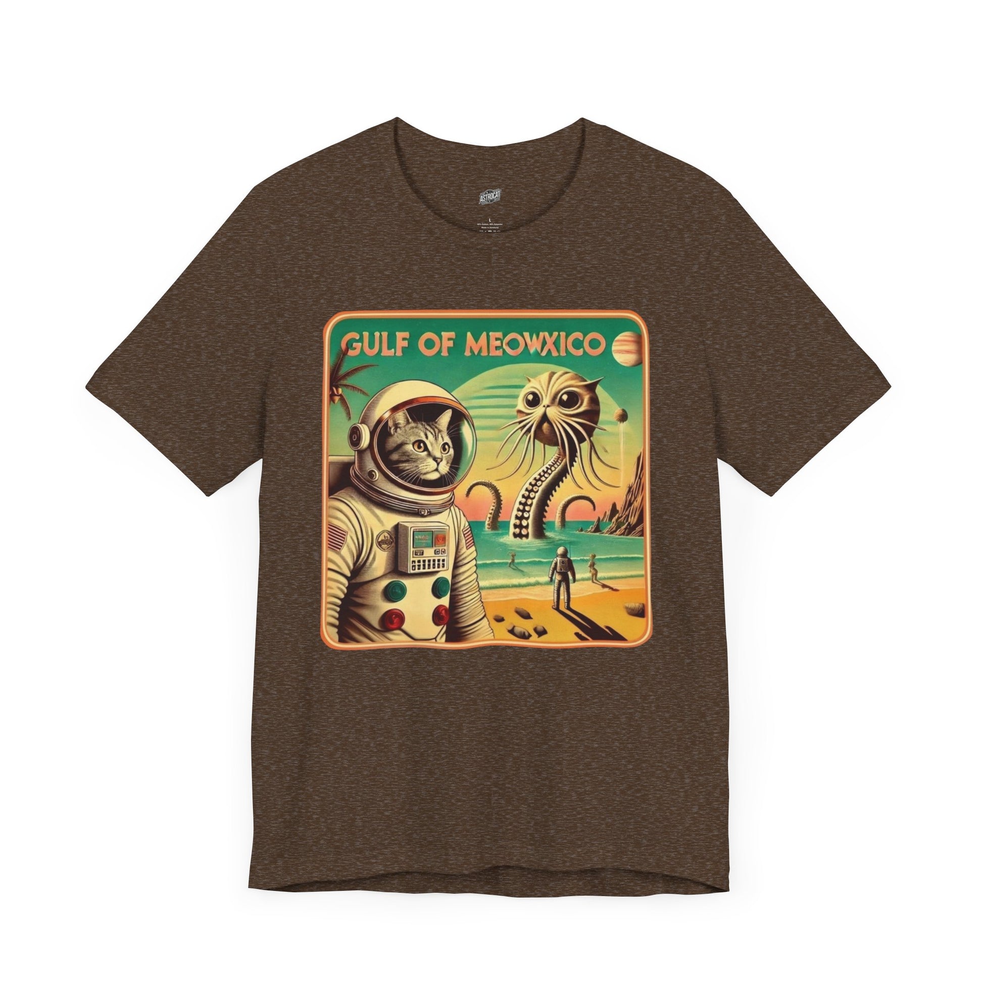 The Gulf Of Meowxico Astrocat Tee is a fun and vibrant shirt that features a unique design perfect for cat lovers and space enthusiasts. Made with 100% lightweight cotton, this tee is breathable and ideal for both active and leisure wear. With a retail fit and classic crew neckline, it's suitable for casual and semi-formal settings. Perfect for holidays, birthdays, and everyday wear.