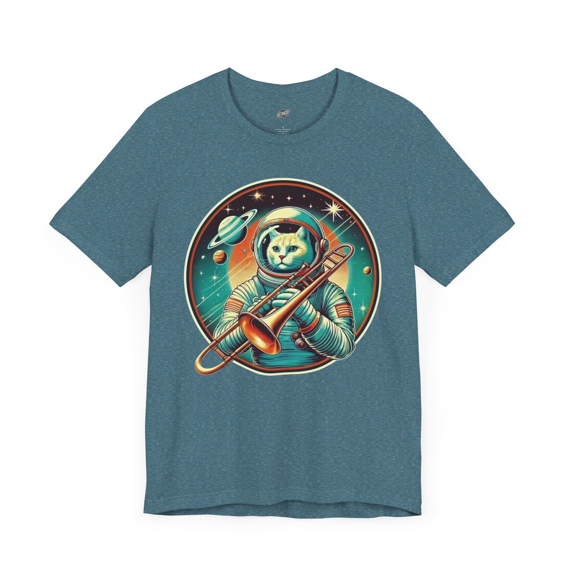 This Trombone Astrocat Tee gives off a quirky and fun vibe, perfect for cat and music lovers. It can be worn casually or dressed up for semi-formal occasions. Ideal for those who enjoy unique graphic tees. Relevant for cat-themed parties, music events, and casual outings.
